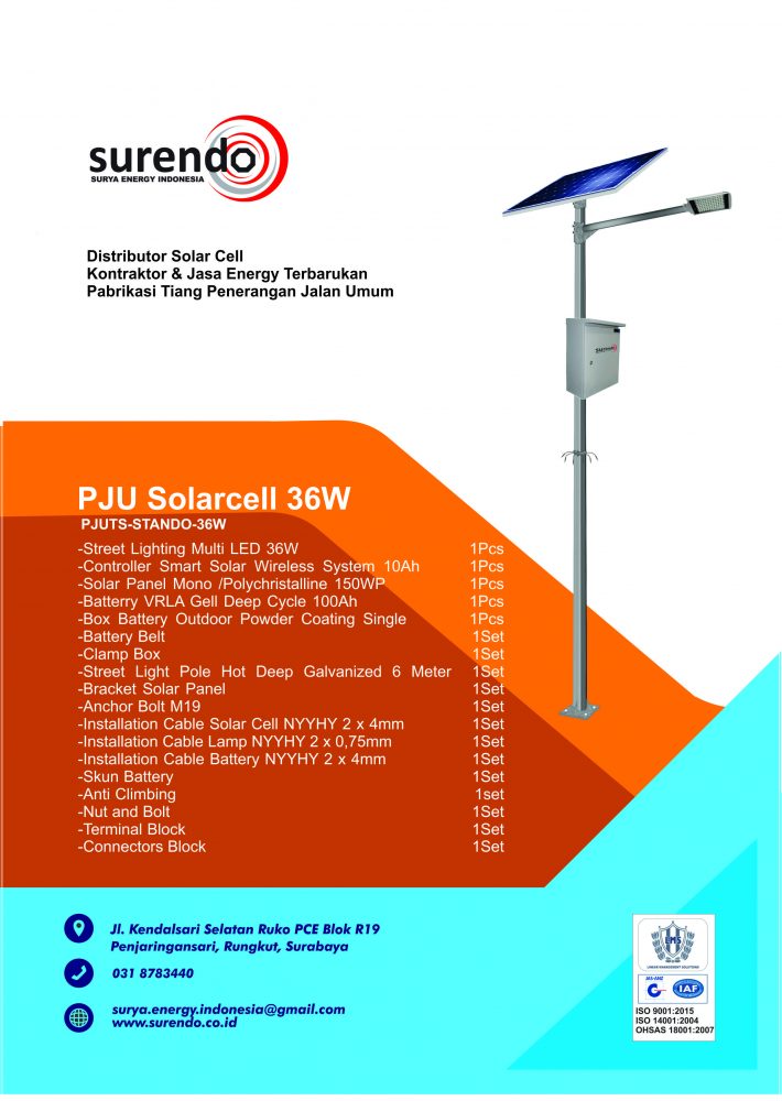 – Lampu LED 36W 12Vdc – Solarcell 150WP Polycristalline – Braket solarcell – Baterai VRLA Gel 100Ah 12V – Box baterai single powder coating – Smart Controller PWM 15A – Tiang Oktagonal 6M Hotdipped galvanized – Aksesoris