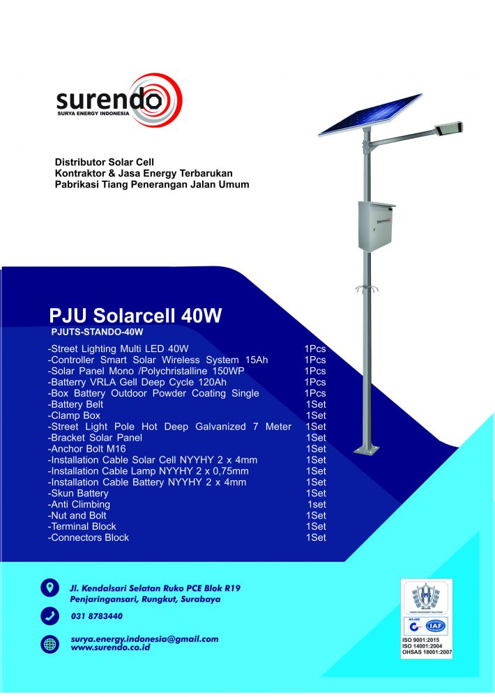 – Lampu LED 40W 12Vdc – Solarcell 150WP Polycristalline – Braket solarcell – Baterai VRLA Gel 120Ah 12V – Box baterai single powder coating – Smart Controller PWM 15A – Tiang Oktagonal 7M Hotdipped galvanized – Aksesoris