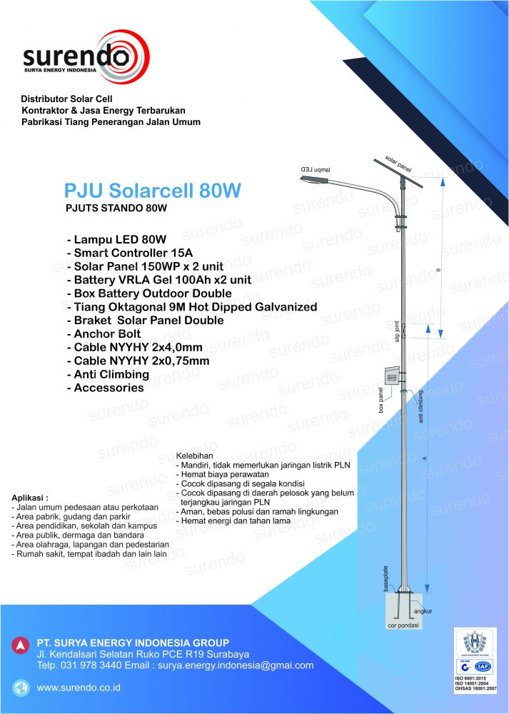 – Lampu LED 80W 12Vdc – Solarcell 2x150WP Polycristalline – Braket solarcell double – Baterai VRLA Gel 2x100Ah 12V – Box baterai double powder coating – Smart Controller PWM 15A – Tiang Oktagonal 9 Hotdipped galvanized – Aksesoris